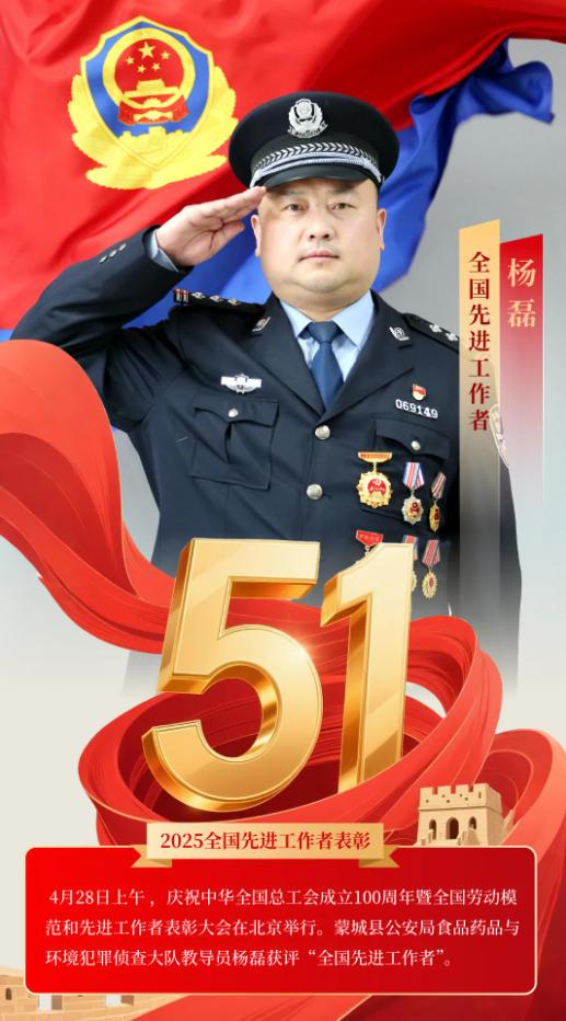 4月28日上午,庆祝中华全国总工会成立100周年暨全国劳动模范和先进工作者表彰大会在北京举行,蒙城县公安局食品药品与环境犯罪侦查大队教导员杨磊获评“全国先进工作者”。